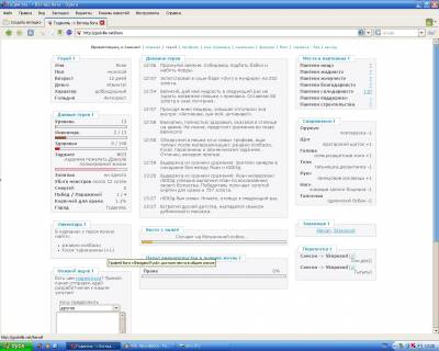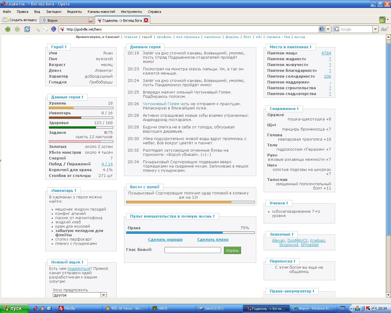 | Герой ↑ Имя Niki Пол мужской Возраст 7 минут Девиз ёмаё я весь в засосах Х_х Характер нейтральный Данные героя ↑ Уровень 1 Инвентарь 2 / 7 Здоровье 59 / 100 Задание №1 вырастить осиновый кол из чеснока и святой воды Золотых несколько Убито монстров несколько Смертей 0 Побед / Поражений 0 / 0 Столбов от столицы 1 шт Инвентарь ↑ В карманах у героя можно найти: золотые зубы клоунский нос (+|-) 13:50 Нашёл на доске объявлений новое задание: вырастить осиновый кол из чеснока и святой воды. 13:50 Набрёл на толпу ролевиков. Эх, молодежь! 13:52 Нашёл золотой с выжженной надписью «Эй! Жертвуй мне, и воздастся! Падай ниц!». (+|-) 13:54 Кладбищенский Гробоед подвешен вверх тормашками на съедение мухам. Запихиваю в мешок золотые зубы. 13:54 Посадил в подлеске варёную картофелину. Если вернусь, будет чем пообедать. 13:54 Был насквозь промочен потоком сознания с небес: «Алё чо так долго качаемся? О_о». За что, Великий? 13:57 Метко пульнул золотым и попал прямо в глаз монстру. 13:57 До чёртиков вглядывался в костёр, пока не узрел «ты чо а? 7 минут а ты всё 1го уровня!!!». 13:58 Почеширский Кот подвешен вверх тормашками на съедение мухам. Запихиваю в мешок клоунский нос. 13:59 Попытался ударить ногой с разворота и вкрутился в землю по колено. Ох и ловкий я. ыы кажись тупая игра =)) а как с другими персами общаться? =)